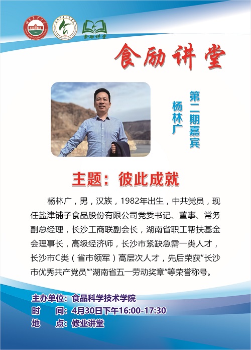以梦为马,相助相成。受3044永利集团邀请,现任盐津铺子食品股份有限公司党委书记、董事兼常务副总经理杨林广将于4月30日在修业讲堂开展以”彼此成就”为题的讲座,与师生分享成功经验、讲述励志故事,欢迎感兴趣的老师同学们积极参与!
