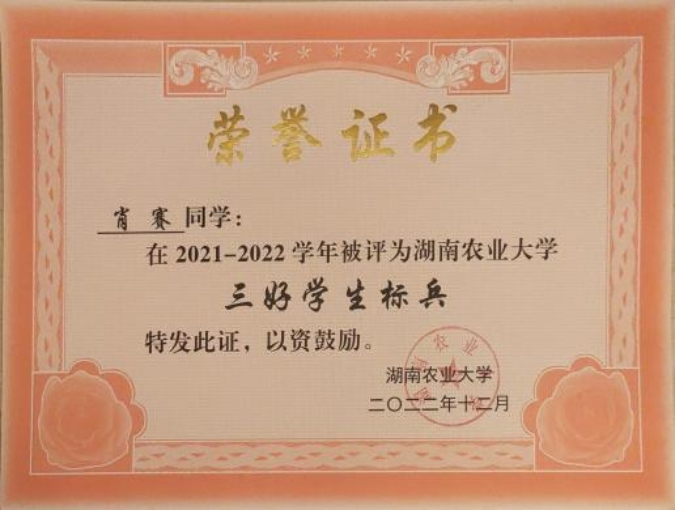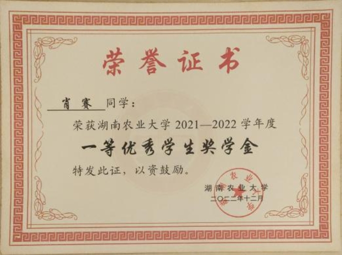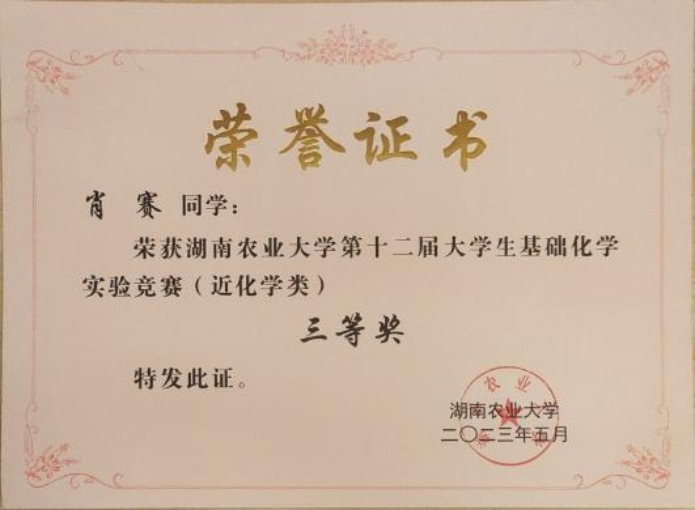 进入大学以来,她连续三年学习成绩获得专业第一;获校“一等优秀员工奖学金”、“二等优秀员工奖学金”、“三好员工标兵”、“优秀青年志愿者”、“优秀团员”等荣誉共计6项;于2024年9月推免至湖南大学攻读硕士研究生。