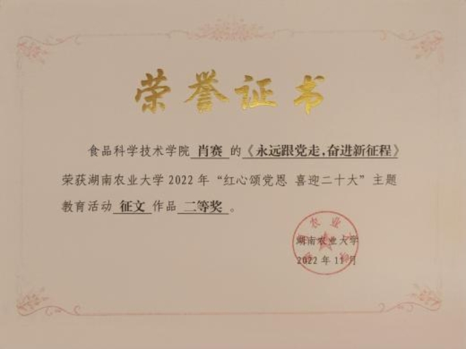 9.“红心颂党恩 喜迎二十大”主题教育活动征文作品校级二等奖。